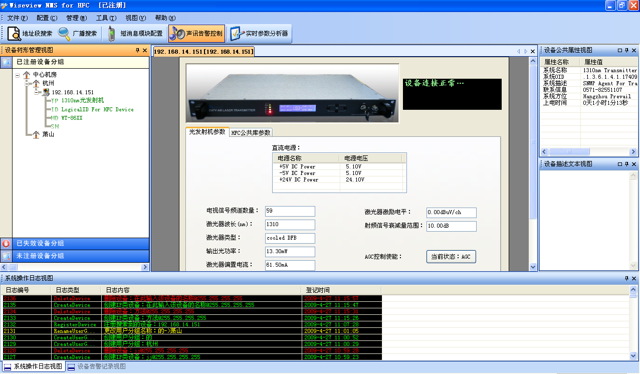 該網管軟件經過幾年來的不斷改進與發展,現在管理設備的范圍基本囊括了HFC傳輸網絡中的所有設備,包括1310光發機,1550光發機,各款光接收機,光工作站,EDFA,光開關,光平臺等設備。