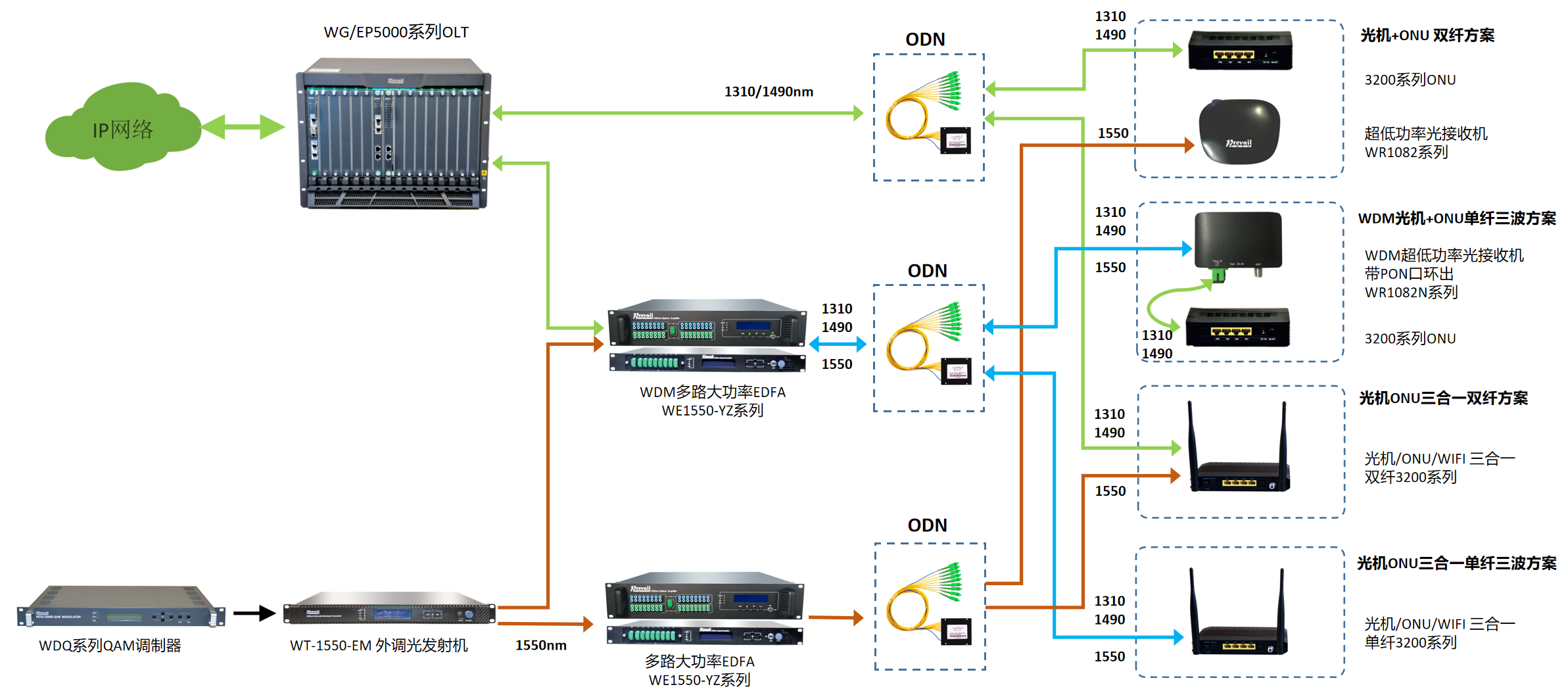 在單纖三波入戶方案中,廣播電視業(yè)務(wù)下行1550nm光信號和PON 1310nm/1490nm光信號在前端機(jī)房經(jīng)過WDM波分復(fù)用設(shè)備合并到一條光纖物理通道,然后再經(jīng)過各級ODN設(shè)備的傳輸和分光后最終到達(dá)用戶家庭,在用戶家庭內(nèi)部,采用我司單纖三波,數(shù)據(jù)+CATV光機(jī)二合一ONU,可直接輸出廣播電視信號和寬帶數(shù)據(jù)信號。也可采用帶WDM PON信號環(huán)出的光接收機(jī),將環(huán)出的PIN信號接入現(xiàn)有的ONU中,從而實現(xiàn)廣播電視業(yè)務(wù)和寬帶數(shù)據(jù)業(yè)務(wù)的分離輸出。